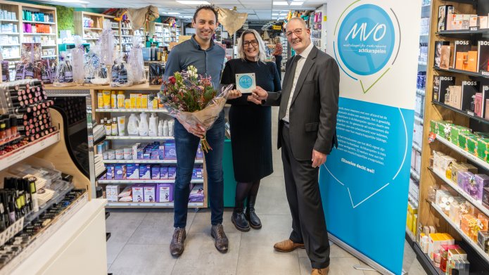 Gisteren vond een bijzonder moment plaats bij Drogisterij Helfrich in Surhuisterveen. Eigenaar Klaas Helfrich werd officieel benoemd tot Buitengewoon Werkgever en ontving het MVO-vignet.