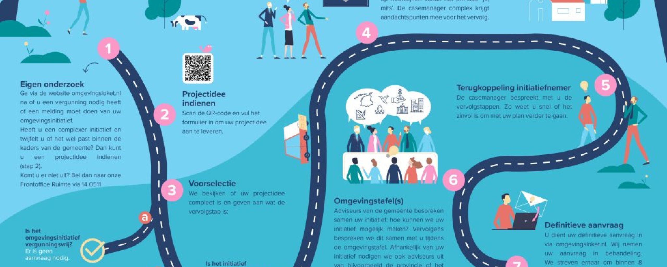 Allereerst vragen we u om ons een duidelijk projectidee aan te leveren (zie: ‘Hoe uitgebreid moet ik mijn projectidee aanleveren?’). Ook bent u zelf verantwoordelijk voor het betrekken van omwonenden en uw omgeving. Dit wordt participatie genoemd. Om u hierbij te helpen hebben wij een participatiebeleid en een handreiking gemaakt [link naar de pagina]. Verder in het proces zal de casemanager u duidelijk aangeven wat nog nodig is. Bijvoorbeeld welke onderzoeken u moet doen om uw projectidee met een vergunning of wijziging van het omgevingsplan mogelijk te maken. Als duidelijk is hoe u uw projectidee mogelijk kunt maken, dient u een aanvraag in met het definitieve plan via het Omgevingsloket.